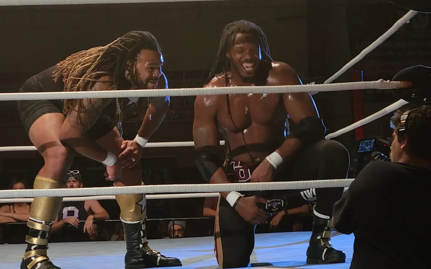 Sonny Defarge and Mr. Crummels entered first to a smattering of boos, the level of which increased when they instructed Chuck Roberts to introduce them as the “TRUE Main Event.” Moments later, the place erupted when “All-Star” Ganon Jones, Jr. and “All Pro” Duke Davis hit the ring. These guys, known as The Mane Event, as two very large, strong, and athletic performers who dwarfed their smaller foes.