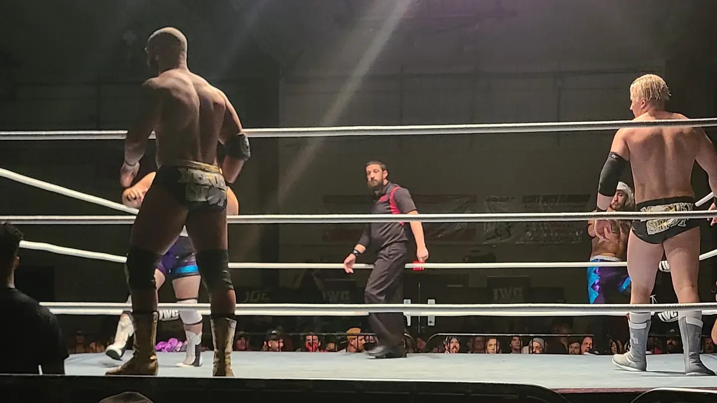 This match was advertised as a one-on-one match between IWC World Champion, Andrew Palace and Spencer Slade. However, after the two combatants made their way to the ring, a siren sounded, and the Reset Button appeared on the screen before Bulk Nasty appeared again to another huge ovation from the crowd. The ring announcer told everyone that Bulk Nasty had activated the Reset Button and made this championship match a triple threat match.