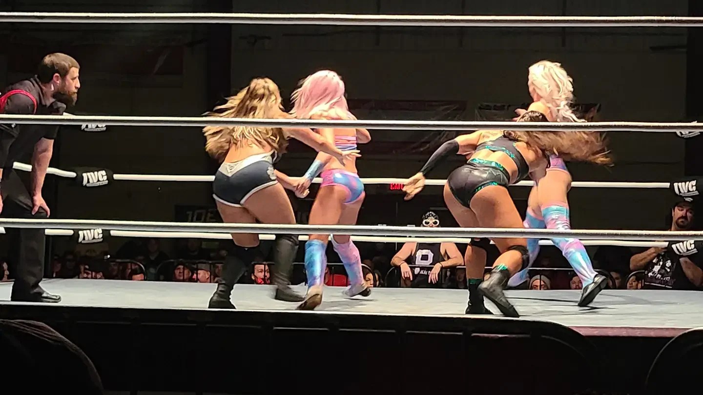 Heather Monroe and Ray Lyn, known as Blonde Force Trauma, who I recognized from earlier in the night when they grabbed me and asked me for my help taking a photo with a fan, entered the ring first for the only women’s match on the card at Unbreakable. Their opponents were IWC Women’s Champion Katie Arquette and Ashley D’Amboise. From the crowd reactions, it was hard to tell which team was the fan favorites.