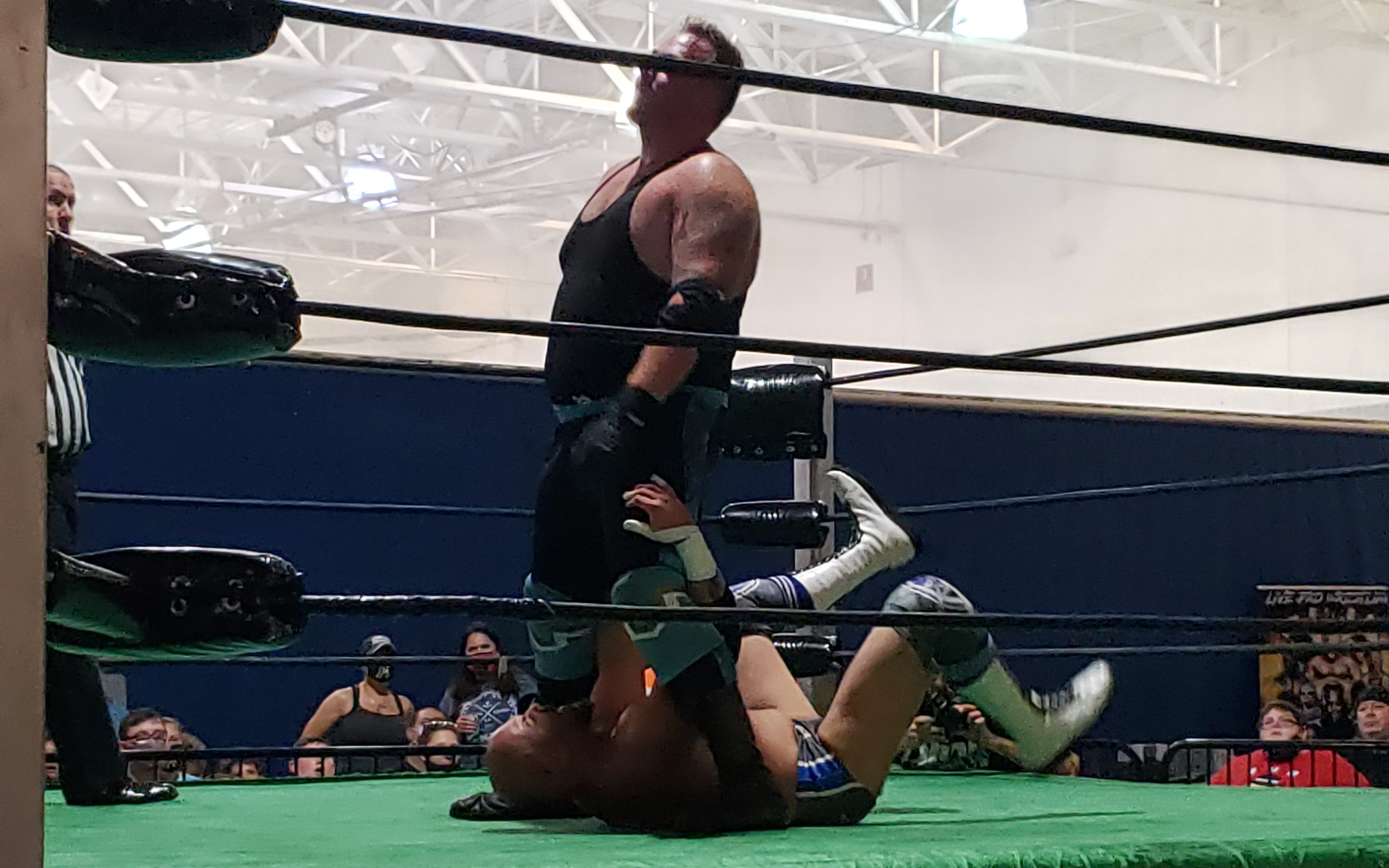 Curcio continued his onslaught with several stomps in one corner, followed by a whip to the other corner. As Curcio grabbed a headlock, the crowd began clapping in support of Greene. The cheers stopped abruptly as Curcio snatched Greene’s hair, driving him to the mat. Curcio appeared to be going for a high risk move on the top rope, but decided better of it. He gently hopped down into the ring, walked over to Greene, and casually stepped on his chest which drew even more heat from the crowd.