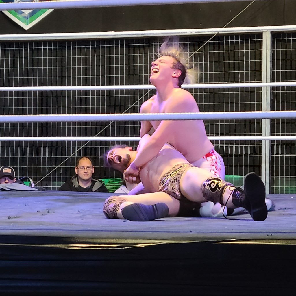 As the match began, The Whisper grabbed a wristlock. Adams fell to the mat and crawled through Whisper’s legs to escape. Over the next couple of minutes, the two competitors exchanged holds as the momentum swung back and forth. After some wrist locks, hammer locks and reversals, the pair reset. A criss-cross flurry ended with an abdominal stretch by Addams to the Whisper, but Whisper reversed into a hammer lock. Addams attempted a snap mare, but Whisper prevented it. Whisper tried his own snap mare, but Addams stopped it. The pair rolled through and it was time for another reset.