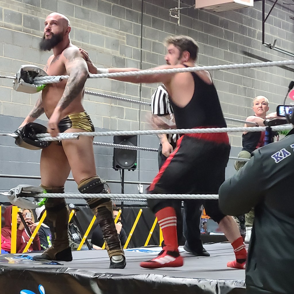 The two behemoths slowly walked to the center of the ring, stared each other in the eye, and began whaling on each other. Tyree Taylor stunned Ali with a headbutt and tried to ram his head into the turnbuckle. Ali blocked and, with Tyree Taylor on the apron, knocked him onto the floor. Ali followed outside where the two men began brawling again. The two men exchanged chops, punches, and forearms until Ivan charged at Tyree Taylor. Taylor moved and Ivan Ali slammed into the ring post, which allowed Tyree to get back in the ring.