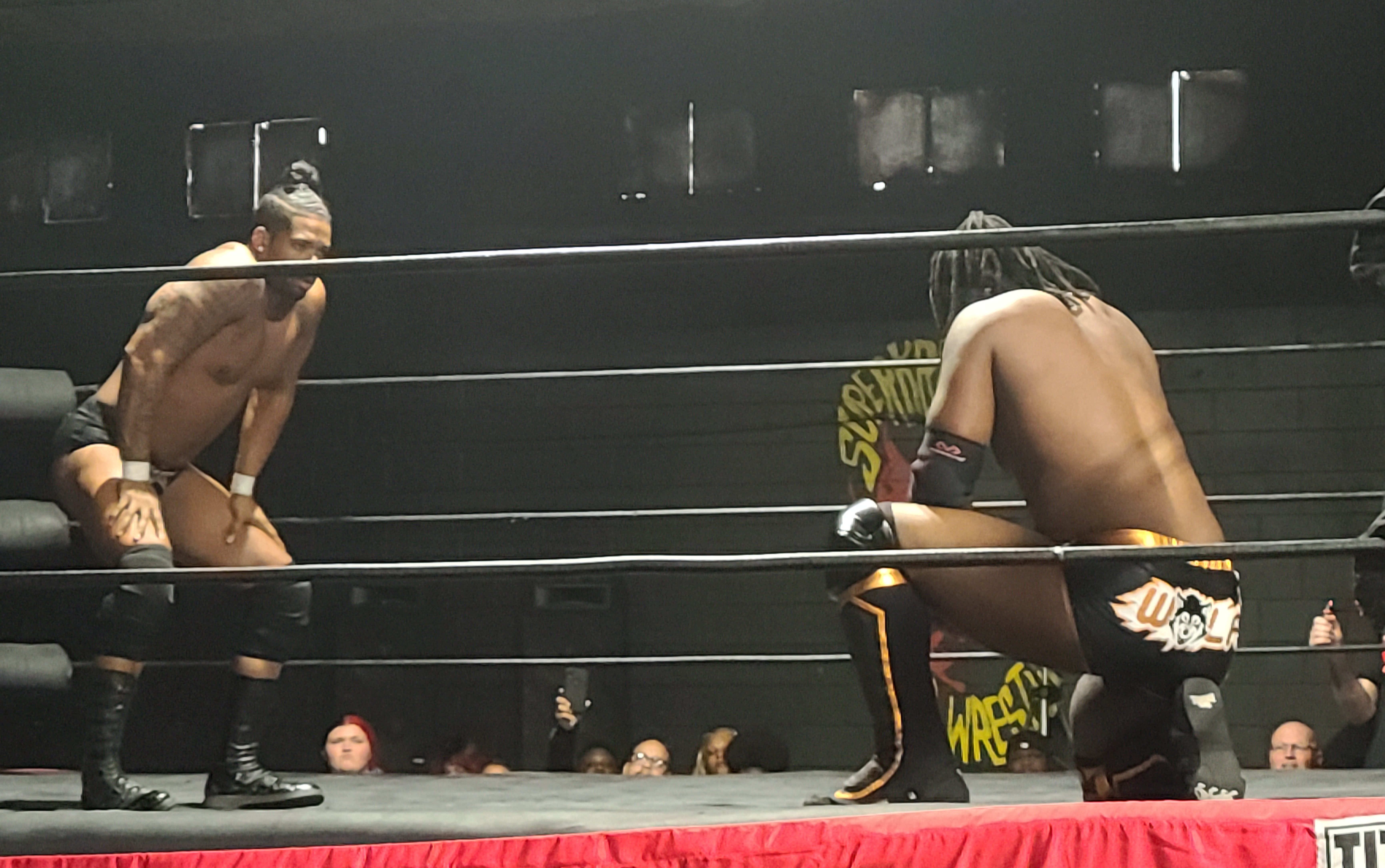 Later Wolf rallied and went to work on the leg of Tony Leyenda. Wolf wrapped Leyenda’s legs around the ring post and attacked them. Back in the ring, Wolf stomped on the leg. Then Wolf placed the leg on the ropes and stomped again. After a Dragon Screw leg whip rendered Leyenda unable to walk, Wolf looked around and noting the hushed silence, said, “You know it’s a good ass whoopin’ when everyone gets quiet”
