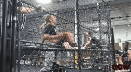 King and Tucker spent the majority of the match, it seemed, either climbing to the top rope or jumping off of it. As soon as the bell sounded, Tucker made a beeline for one corner and tried to scale the cage to escape. King climbed up with her and bulldogged the challenger back down to the mat.