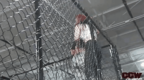 On the outside of the ring, Cage threw Facade over the guardrail and hit several chops to Facade who had fallen into a ringside seat. Cage gorilla pressed his opponent back up and over the guardrail and then threw him back into the ring.