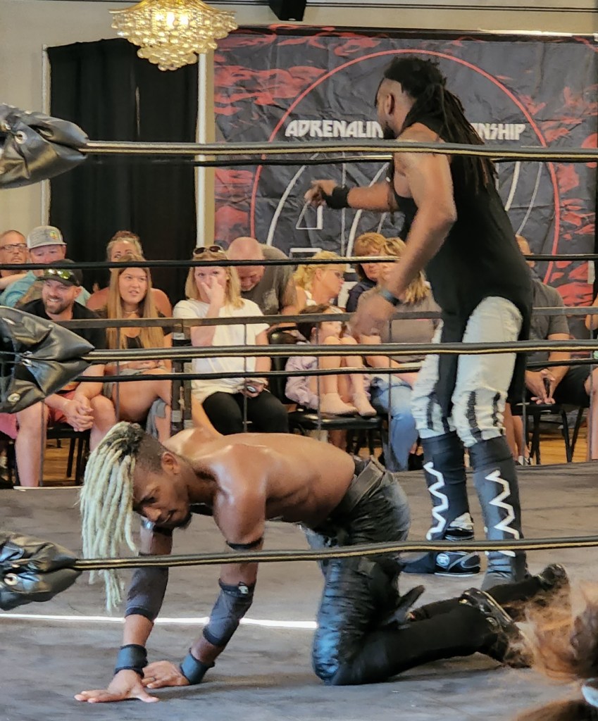 Adena Steele, who I first encountered at Intergender Bonanza IGB10 last November, was clearly the fan favorite in this contest. As Nikii Duke made her way to the ring, the crowd chanted, “You are bougie!” Duke faked a handshake with Steele, but hit her with a knee to the midsection instead, pushed her head into the turnbuckle, and choked Steele with her boot from a standing position.