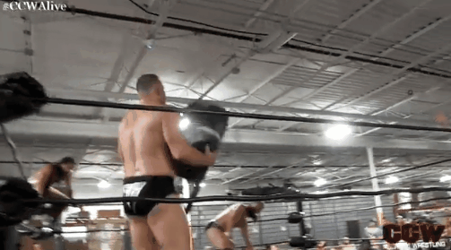 Stevens and Read were the first competitors up on their feet. After some hard chops, Stevens reversed Read off the ropes with a Samoan Drop. Ever the opportunist, Marshall leapt to his feet, threw Stevens out of the ring, and attempted to pin Read himself. When Marshall took a moment to make an obscene gesture to the CCW fans, Read and Stevens came back with a simultaneous sunset flip and German suplex that, again, left all three men down.