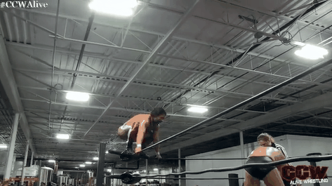 With both men down, Chamberlain crawled over for the pin, but could only manage a two count. As both men rose, Stevens reversed Chamberlain into an Olympic slam. Stevens climbed to the top rope and Chamberlain followed. Stevens knocked Chamberlain off with a bite to the face and went for a blockbuster. Chamberlain, however, had the presence of mind to pull referee Amy Veronica into Stevens path at the last minute.