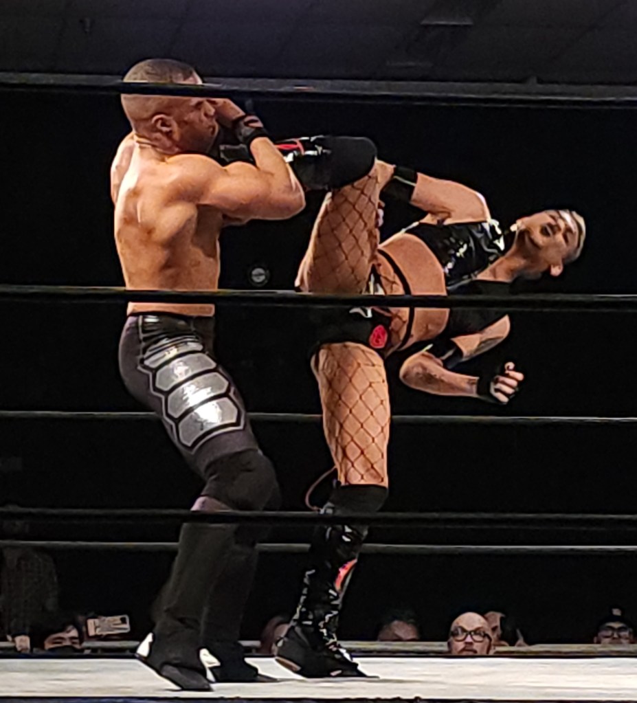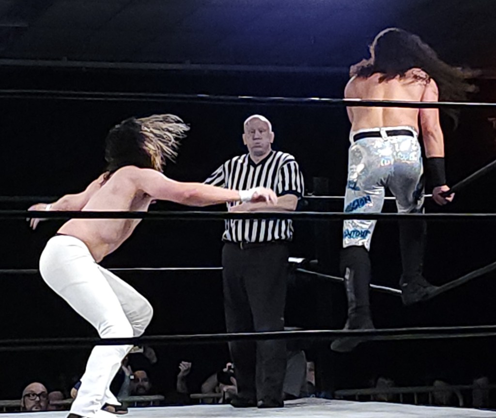 Hyena Hexx withstood an early barrage of strikes from fan favorite Jay Charro, but used an illegal throat punch to stun Charro and regain control of the match. Hexx hit a running knee with Charro on the apron, then choked Charro with the middle rope in spite of the referee’s admonitions. Hex, overwrought with confidence, made a lazy pin attempt after a backflip double knee strike and was somehow surprised when Charro kicked out and kept fighting.
