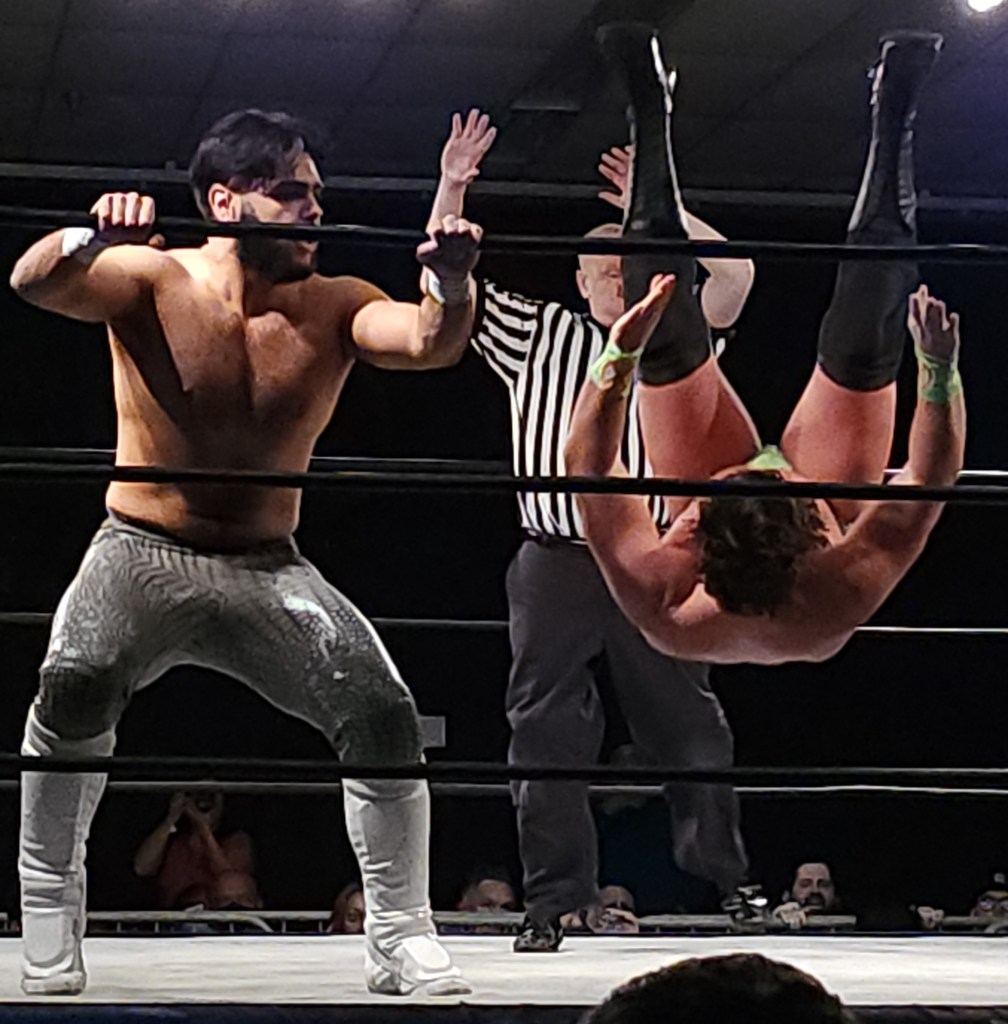 Heathen used a chin lock on the mat to slow things down and forced Cruz back to the mat every time he tried to stand and break the hold. Cruz eventually used a series of elbows to create enough space to allow the hot tag to Lor Diaz. Lor quickly took over, at one point putting Nikita on Amir’s shoulders and kicking out Amir’s leg to send them both crashing to the mat. When Diego Cruz re-engaged, he assisted Lor Diaz in a sling blade variation on the Hart Attack that ended all hope for Heathen and Nikita.