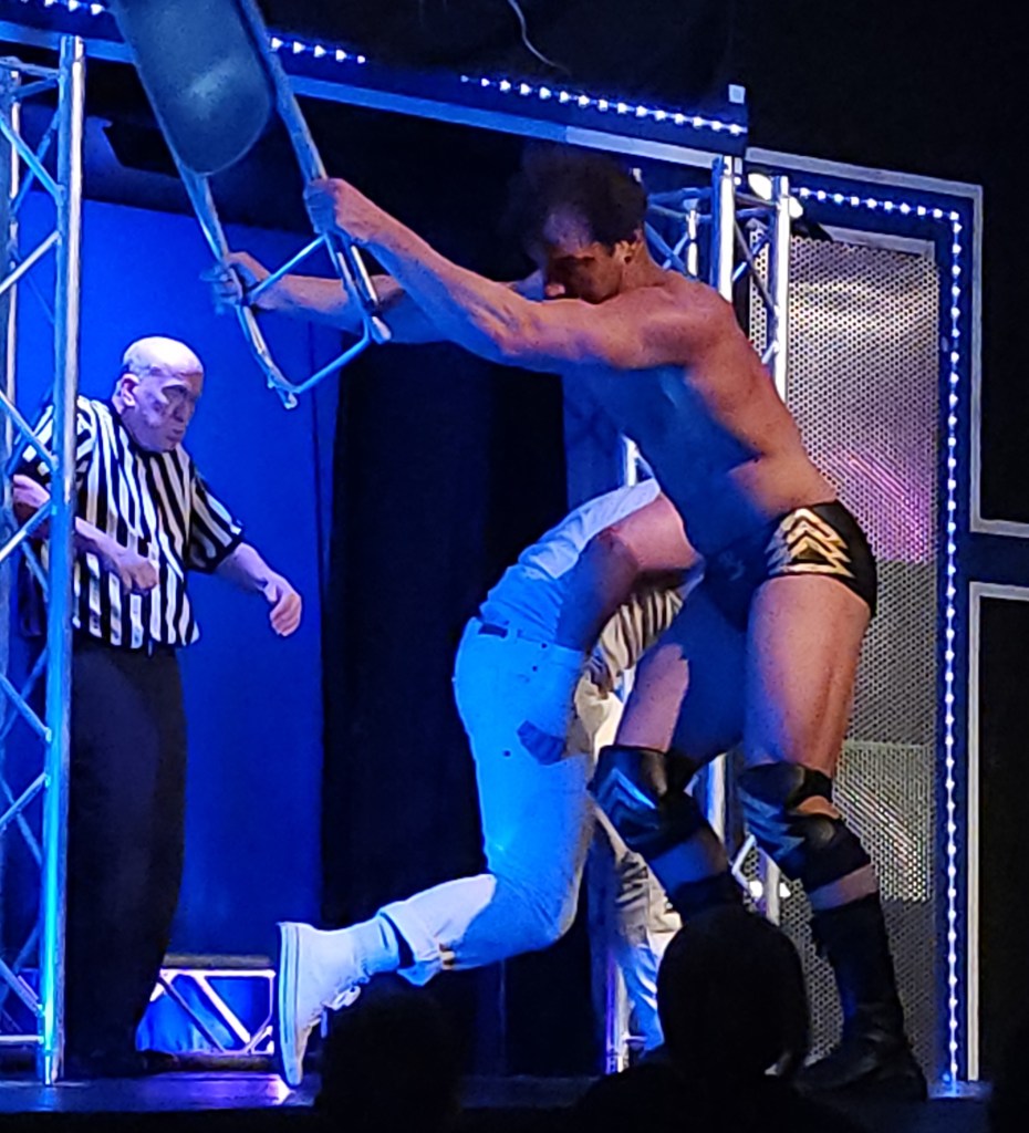 Ryan grabbed the ring bell from the timekeeper’s table and chased Locke around the ring. Zukko set up a chair outside the ring, forced Locke into it, put the ring bell on his lap and comedically rang it repeatedly as Locke screamed in pain. Zukko threw Locke back into the ring and set up a structure composed of five chairs, strategically stacked, in the center of the ring. Of course, when a wrestler sets up a contraption like that, you know that wrestler will be the one who ends up going through it.