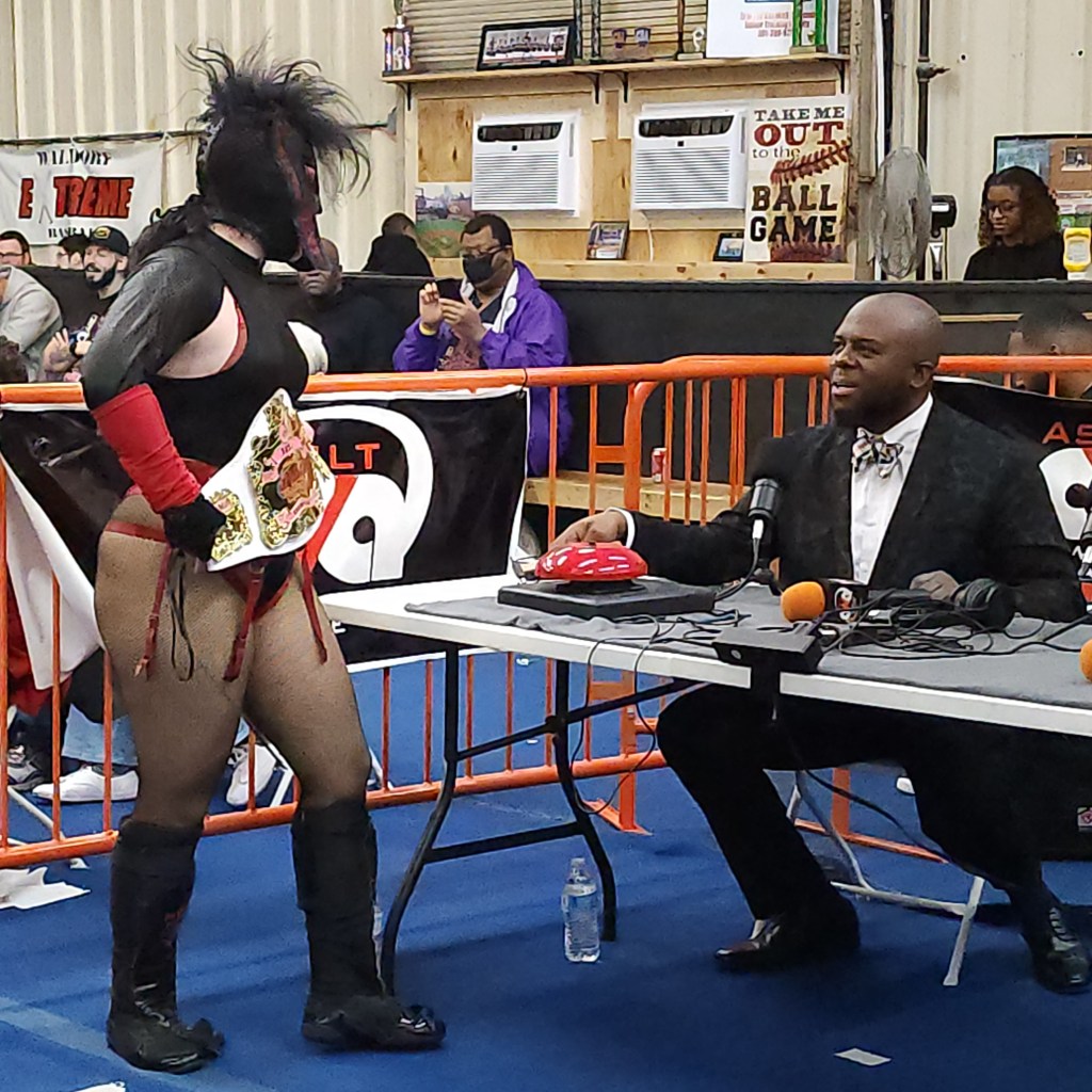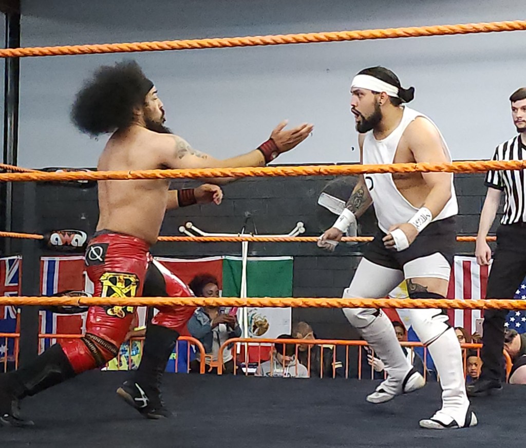 As usual, Irvin Legend started the match playing mind games with his former protégé, the Mat Monster, Zion Hart. Legend refused to get in the ring at first, then slapped Hart across the face. The two men brawled until Legend gained the upper hand and continued insulting Hart by rubbing Hart’s face in the mat.