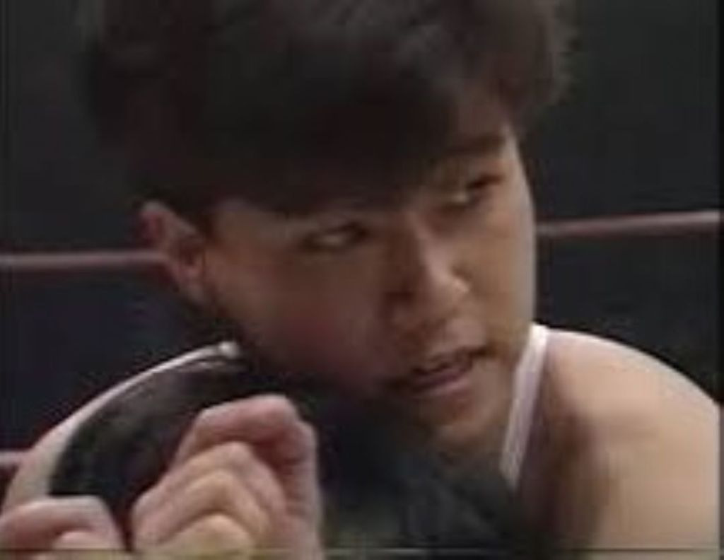 Kimura ran in and grabbed the bamboo. At the same time, Inoue picked up the nun chucks and belted Kimura before she could do any damage. Kong picked up the nun chucks and slammed them into Kyoko Inoue’s leg, then picked up a chain and stood high on the second rope to get extra leverage to choke Inoue.