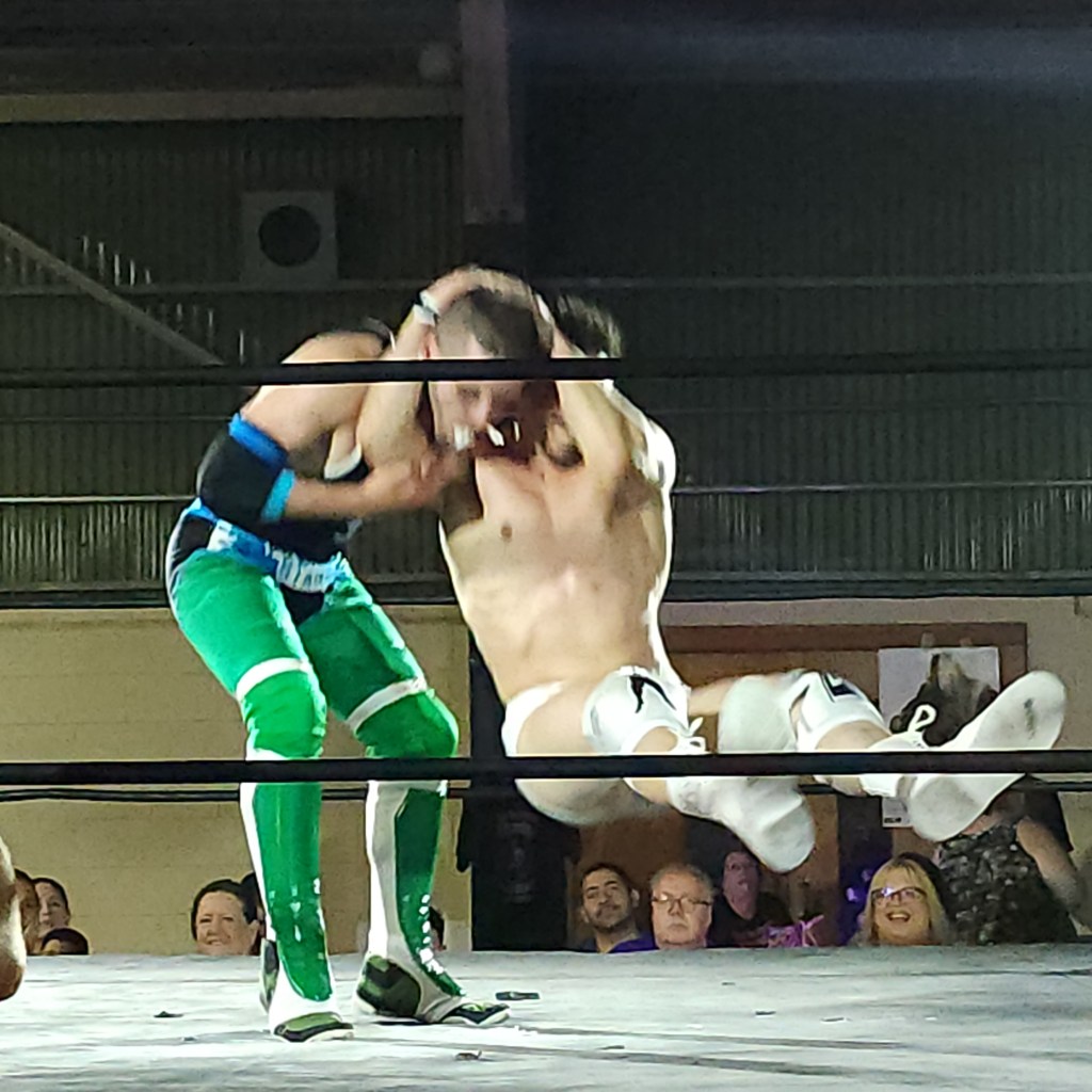 At this point, each of the Take it Home Brothers shushed the crowd so they could unload some of the loudest chops I have ever heard live. Jeff Noyze returned and hit an dropkick, then stood on Ryan’s neck in the corner. The challengers continued to tag in and out while inflicting massive amounts of punishment on C.J. Ryan.