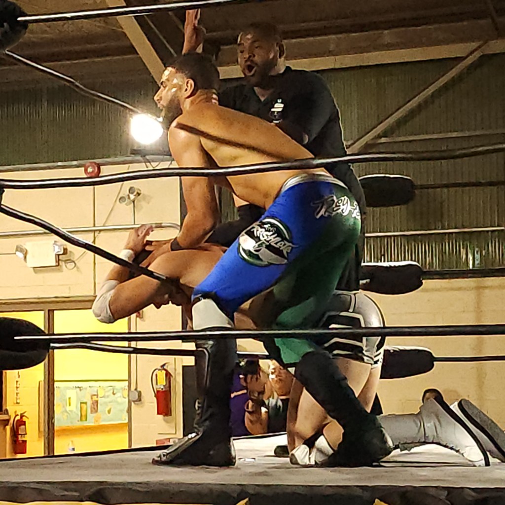 As the match wound down, it was , again, Smiley with the big move. Steven Person Person lifted James Gray onto his shoulders at the same time Tony Chini lifted E-Money Milli onto his. Smiley climbed to the top rope and hit a Double Doomsday Device that brought all four men crashing down to the mat. It was an amazing spot you have to see.