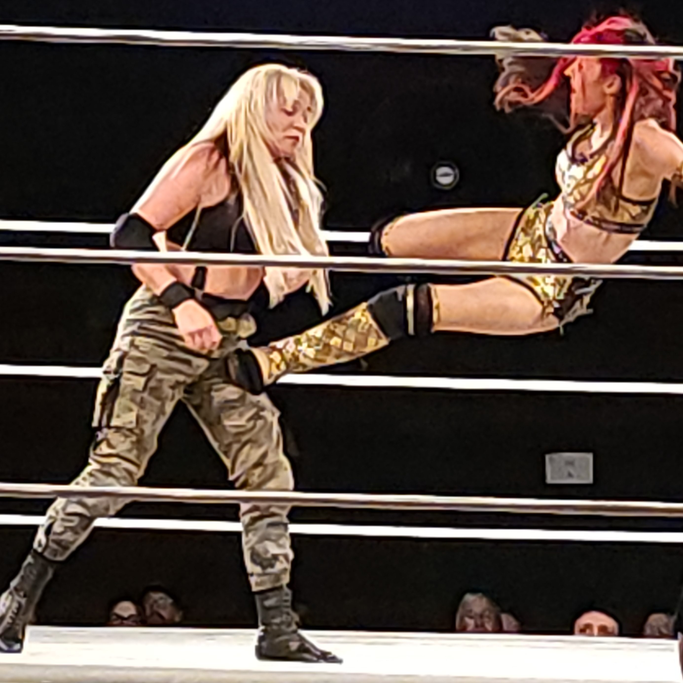 Before A.C. could admire his accomplishment, Myles Hawkins pushed A.C. off the apron and onto the floor. Furious, Cole jumped back onto the apron and, with the help of Brandon Scott, eliminated Myles Hawkins. Security descended on the area as Hawkins and A.C. fought toward the back. The next thing I know, I turned to see Hawkins hurl himself off the entrance ramp onto Cole on the floor as they continued to fight back to the dressing room.