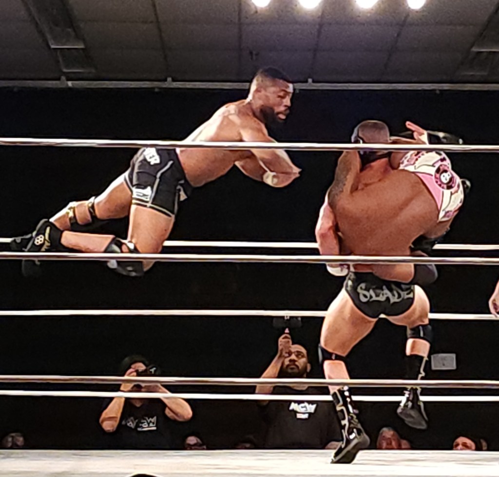 When Slade tagged Tim Spriggs, Lennox managed to break free and make the tag to Drolix. Drolix hit the ring on fire and dropped Spriggs as Slade re-entered to assist his partner. Cassius “Cash” Carter ran in, as well, and got hit with a 3D from Black Wallstreet which brough the crowd to their feet.