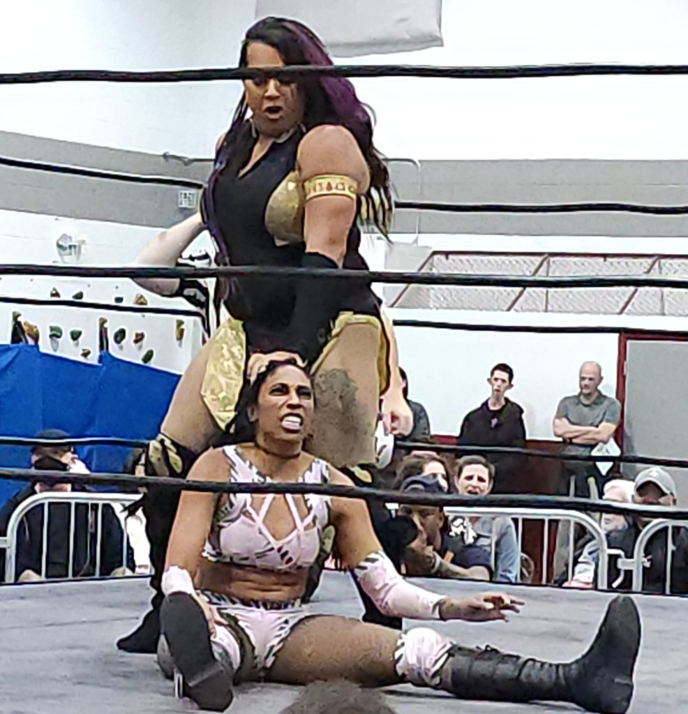Nyla thwarted a Hera rally attempt with a headbutt and back suplex, then stood over the seated Hyena and unloaded with a barrage of strikes. Rose slammed Hera twice and went for a third. Hera escaped and tried to mount another comeback with a series of strikes and got on Rose’s back with a sleeper hold. Rose easily backed Hera into one corner, then whipped her across the ring face-first into another. Rose followed with a back elbow, clothesline and choke slam.
