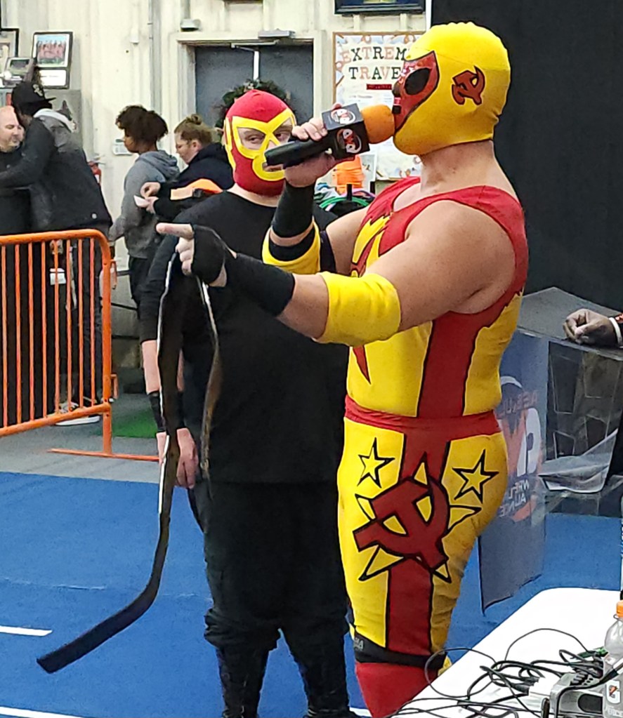 Moments later, two masked men in red masks adorned with Russian sickles ran in from the back and attacked Hernandez and his partner Cesar Bambino. Bambino was quickly dispatched, leaving Hernandez to a two-on-one beat down until the Russians turned their attention to the Blood Brothers outside the ring.