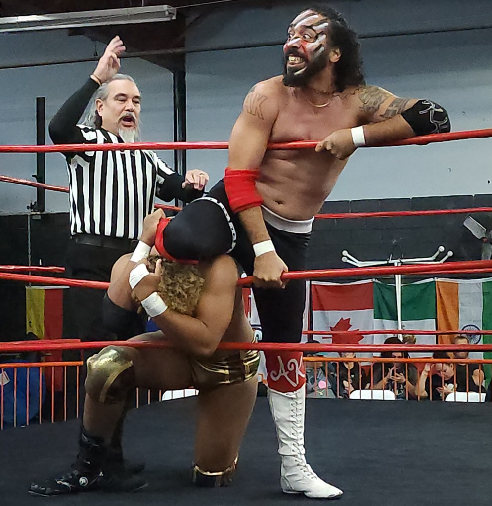 Still with no idea who the third team would be, the Golden Glovers and the Blood Brothers brawled at ringside and immediately involved weapons. When the action finally made its way to the ring, Landon Hernandez and OTP, subbing for the incarcerated Maxx Mercy, faced off briefly in the center of the ring. OTP hit a back body drop that sent Landon Hernandez crashing into a ladder set up in one corner.