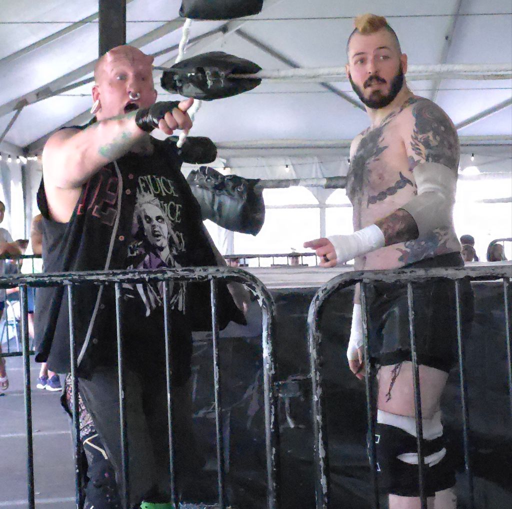 After O’Ryan prevented a pinfall at the last second, Napier went outside to retrieve the barbed wire bat. When Napier swung the bat, O’Ryan took it from him. O’Ryan histated for a second, then thought better of using the bat on Napier. Instead, O’Ryan tossed it out of the ring, then teamed up with TMHK for a DDT/choke slam combination to pick up the win.