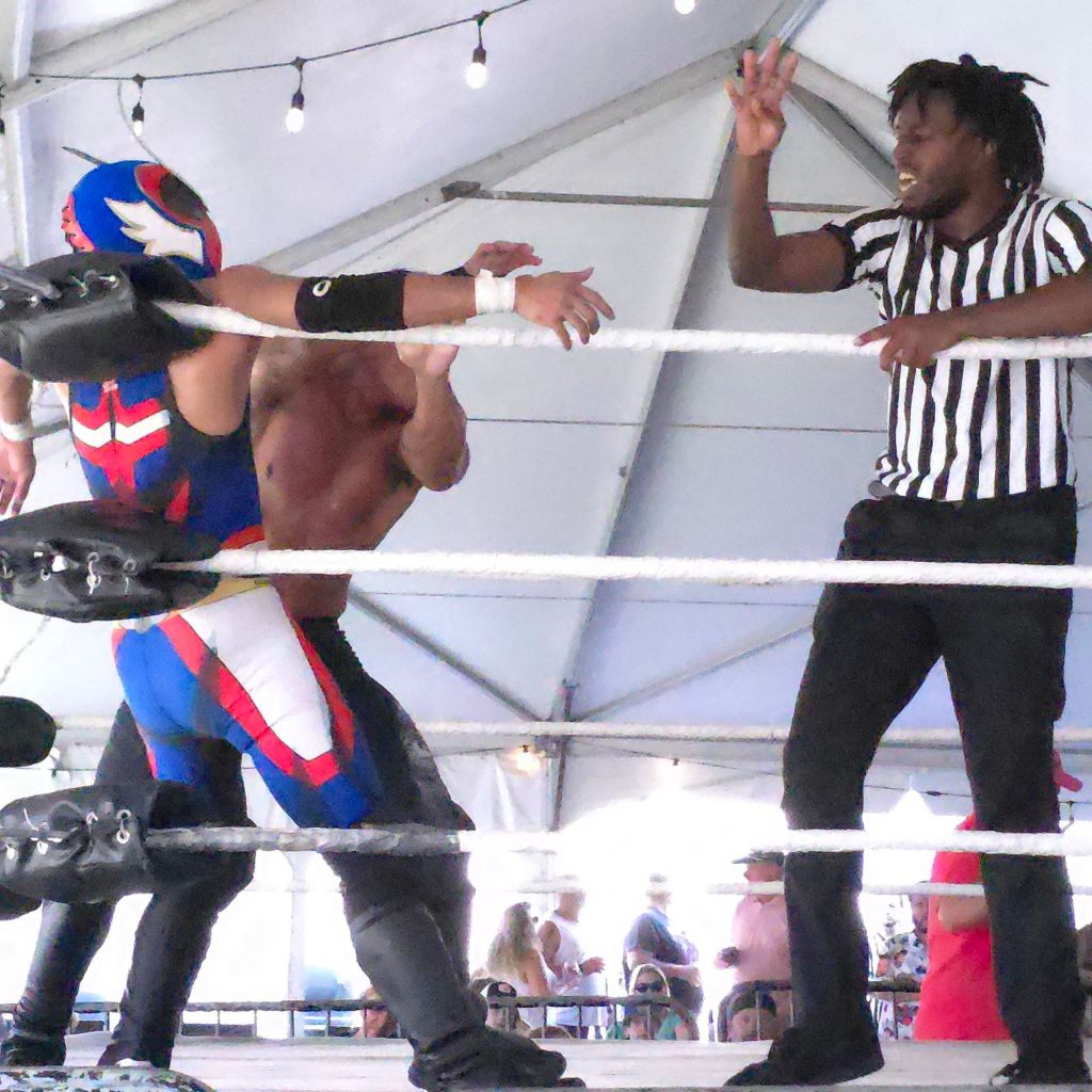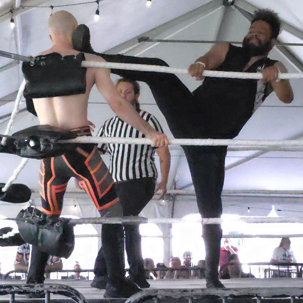 Erwin von Scharf fought back in one corner and dropped an elbow on Cheeseburger. When that garnered just a one count, von Scharf grabbed an arm bar and started biting Cheeseburger’s forearm. When the referee forced a break, von Scharf went back to the arm bar. Cheeseburger fought his way out of the hold and charged, but von Scharf tripped him and started choking him with the middle rope.