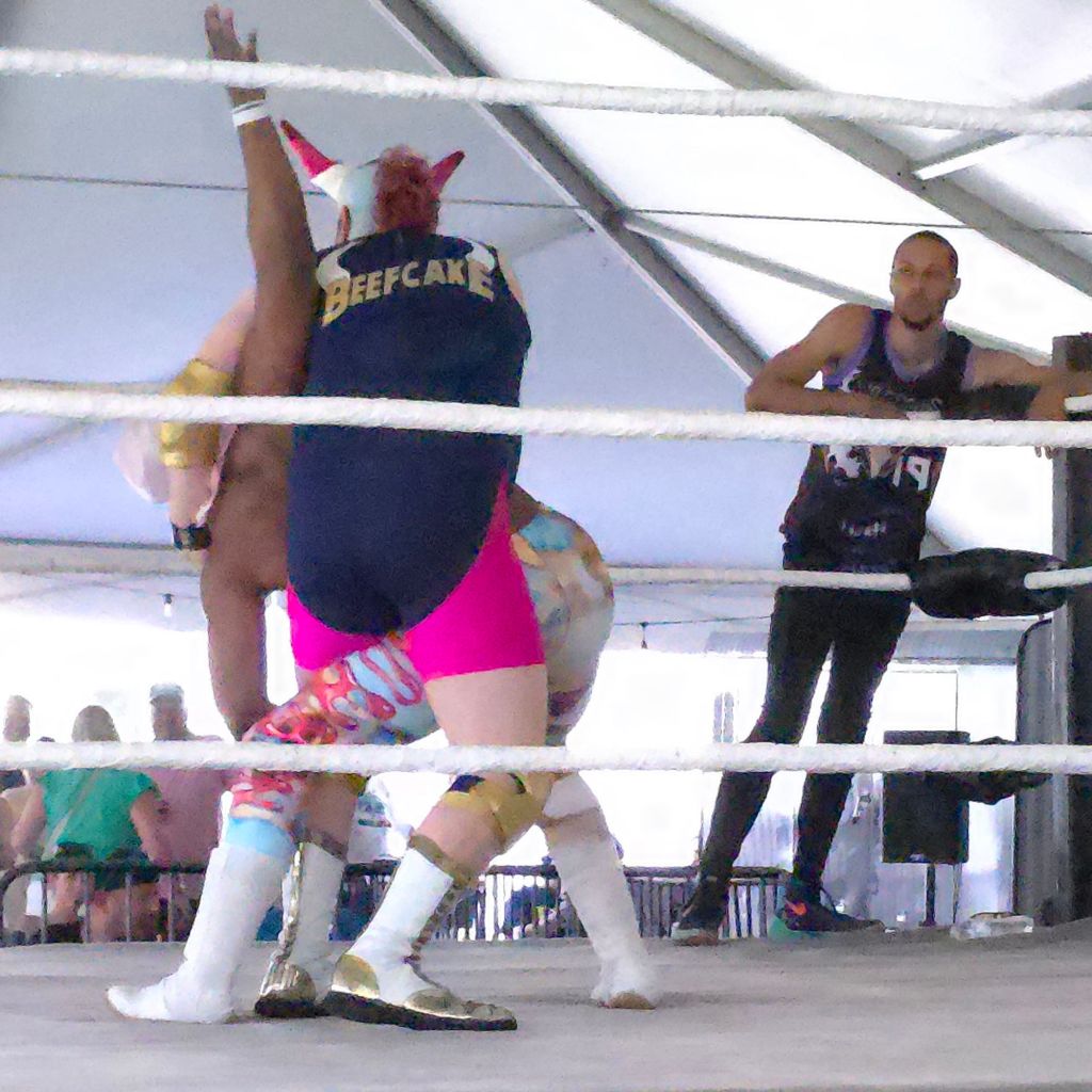 Beefcake and JohnLee Kirk exchanged abdominal stretches at the very beginning of the match. Kirk escaped the last stretch, but his ensuing shoulder tackles had no effect. Instead, Beefcake dropped Kirk with just one shoulder tackle, then tagged Colin Sheen. Sheen and Beefcake hit back-to-back splashes, then Beefcake whipped Sheen into Kirk for a third splash.