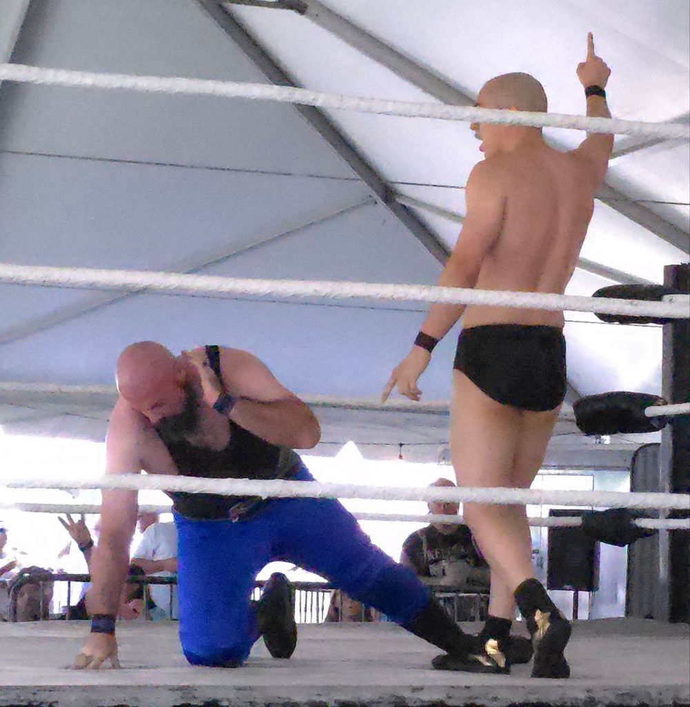 George LaFleur and Oldman Youngboy put on an impressive display of chain wrestling in the opening moments of this match, but a less scientific move shifted the momentum when LaFleur yanked Youngboy’s mustache off of his face. In response, Oldman Youngboy locked LaFleur in a modified Camel Clutch. By “modified,” I mean that, instead of grabbing the chin, Youngboy used the handle bars of LaFleur’s mustache for leverage.