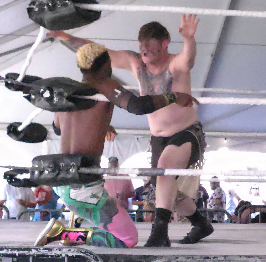 After an extended feeling out process, leading to several resets, Stelman Smith tried to use shoulder tackles against Maryland Champion, Christopher Andino. When those had no effect whatsoever, Andino took his turn and leveled the challenger on the first try. Now on offense, Andino hit a few loud chops, then grabbed Smith by the head and ran his face along the top ring rope.
